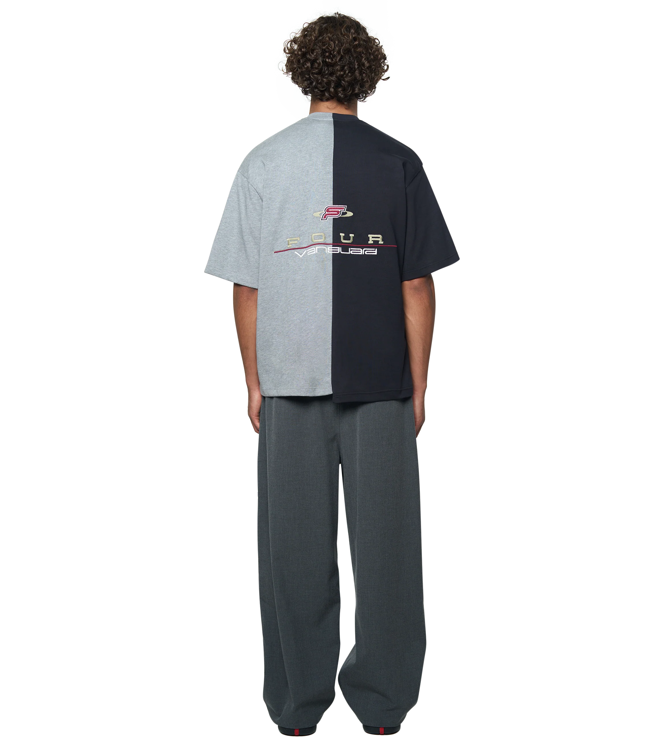 The design is elevated with embroidery artwork on the front and back, bringing a tactile dimension to its bold split-tone palette. With its oversized cut and premium details, this tee merges graphic identity with refined craftsmanship for modern streetwear styling.